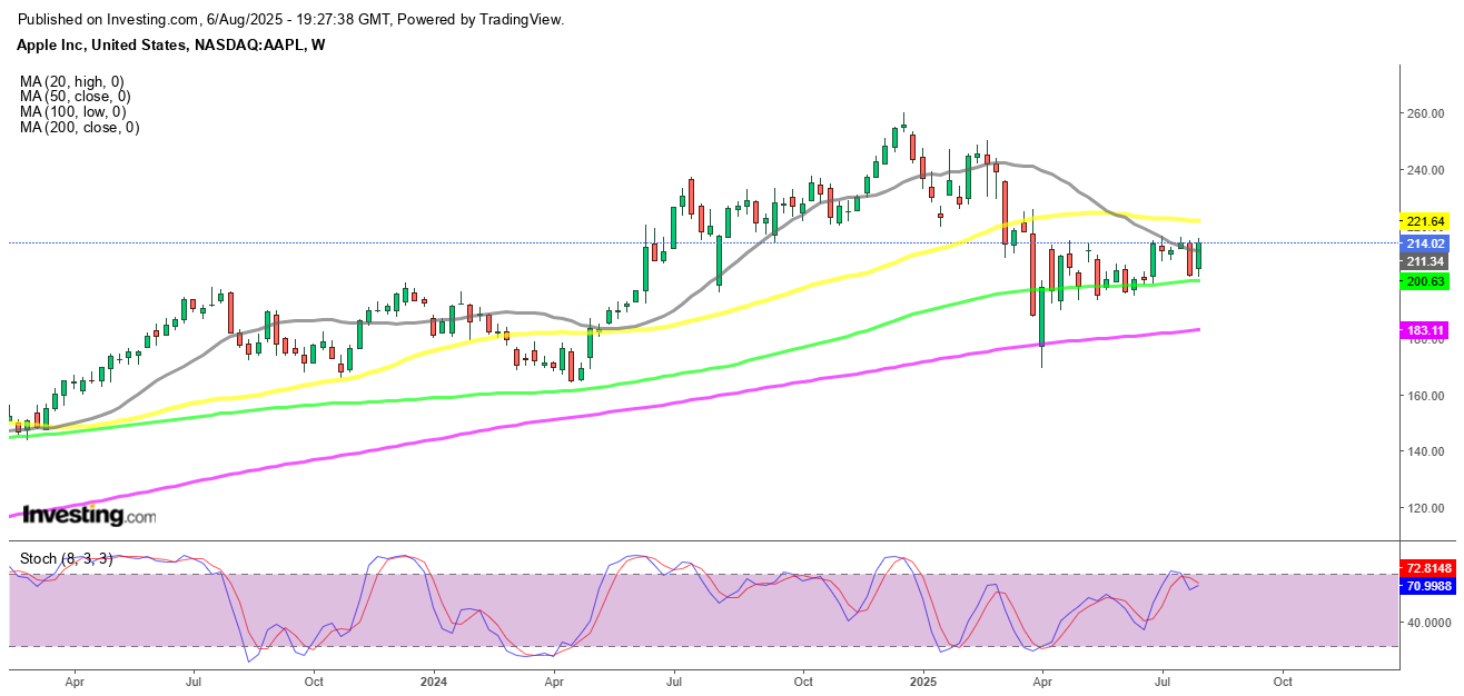 From a technical standpoint, Apple’s 100‑day simple moving average (SMA) has served as a stubborn ceiling for bullish momentum, repeatedly rejecting breakout attempts. The next key resistance zone lies at the weekly 50‑day SMA near $216, and a clear breakout above this level could mark the start of a trend reversal.