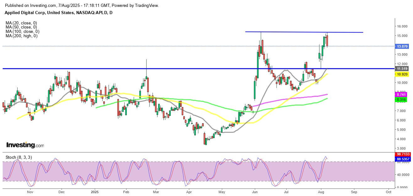 Despite the bullish headlines and strong price action, Applied Digital failed once again to decisively break above the $15.40 resistance zone—a level that’s capped prior rallies. Since reaching that ceiling, the stock has dropped roughly 12%, suggesting that investors may be cashing in some gains after the sharp run-up.