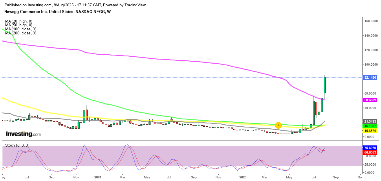 Newegg Commerce (NASDAQ: NEGG) continued its extraordinary rise this week, climbing another 56% following a 60% surge last week. On Friday alone, the stock jumped 40%, cracking above the late-July resistance level of $70 and peaking at $84.60 during intraday trade. This rebound marks a spectacular reversal from the mid-July low of $25, when shares had plunged over 50%.