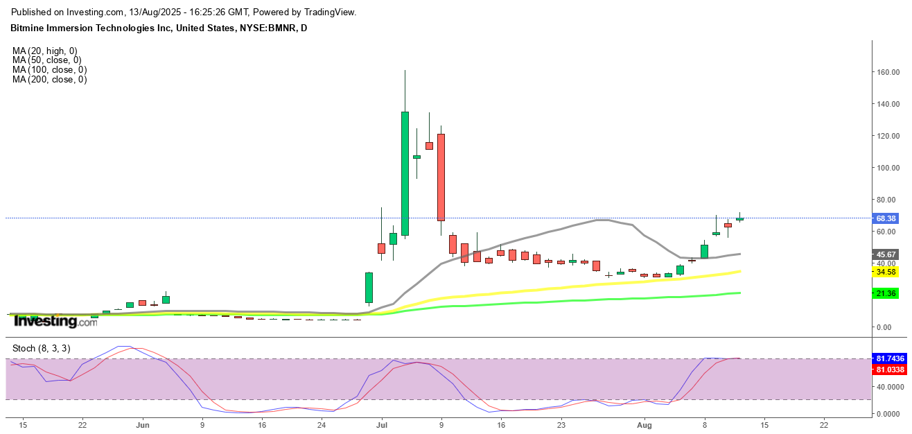 Shares of BitMine Immersion Technologies, Inc. (NYSE: BMNR) climbed 15% on Tuesday, extending a rally that has propelled the stock more than 130% higher over the past week, topping $70. This recovery follows a deep July selloff and was driven by a combination of the company’s massive Ethereum holdings and a broad cryptocurrency market surge.