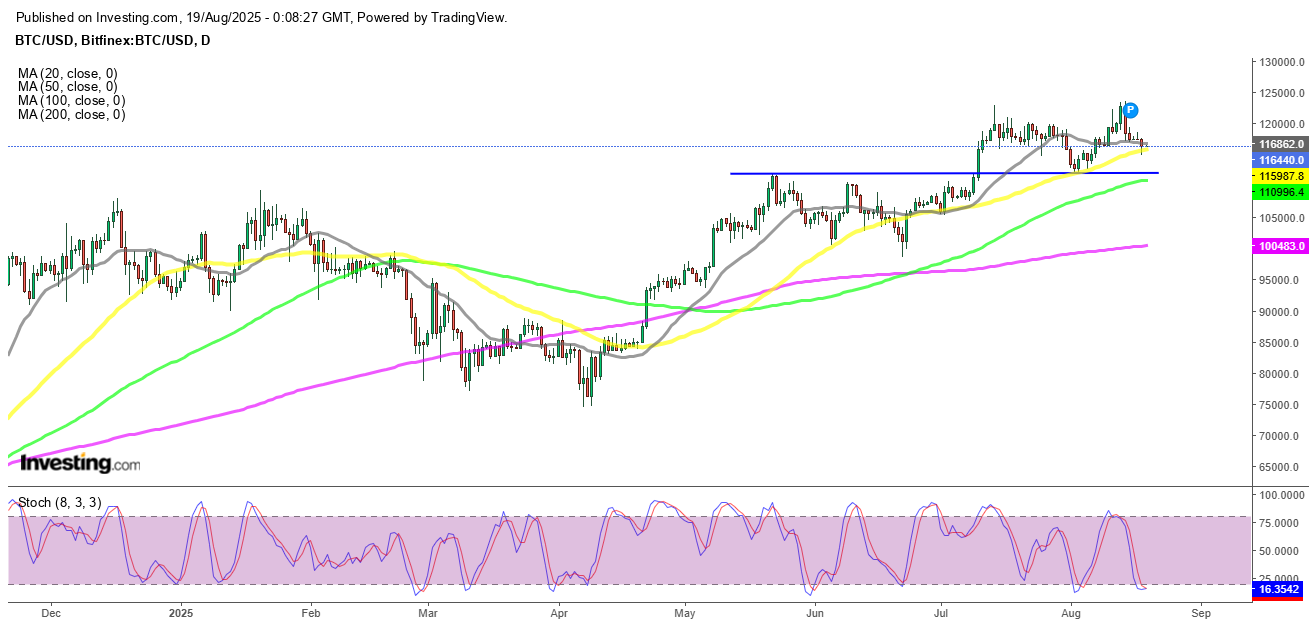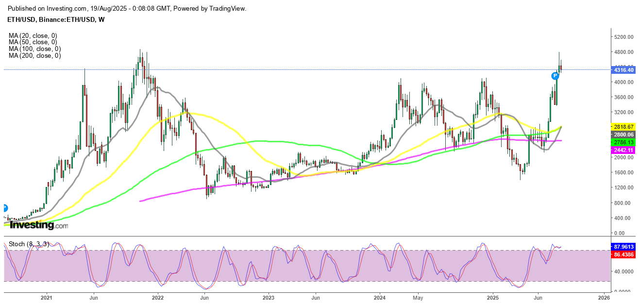 However, enthusiasm faltered after Treasury Secretary Scott Bessent confirmed the U.S. would not expand Bitcoin reserves and inflation data came in hotter than expected. This triggered a sharp correction, dragging BTC down to $117,000 over the weekend. Chart signals: Two consecutive doji candlesticks hinted at exhaustion, and the pullback found solid support at the 50-week SMA, reinforcing the long-term bullish trend.