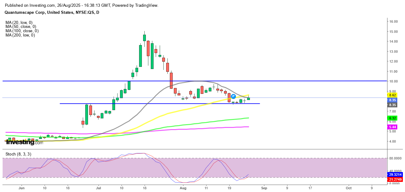 After soaring more than 350% between late June and early July—from $4.25 to nearly $15—QuantumScape quickly fell back under pressure. A failed rally attempt in early August pushed the stock below its 50-day simple moving average, while the $10 level turned into tough resistance as the 20-day SMA (gray) capped upside attempts.