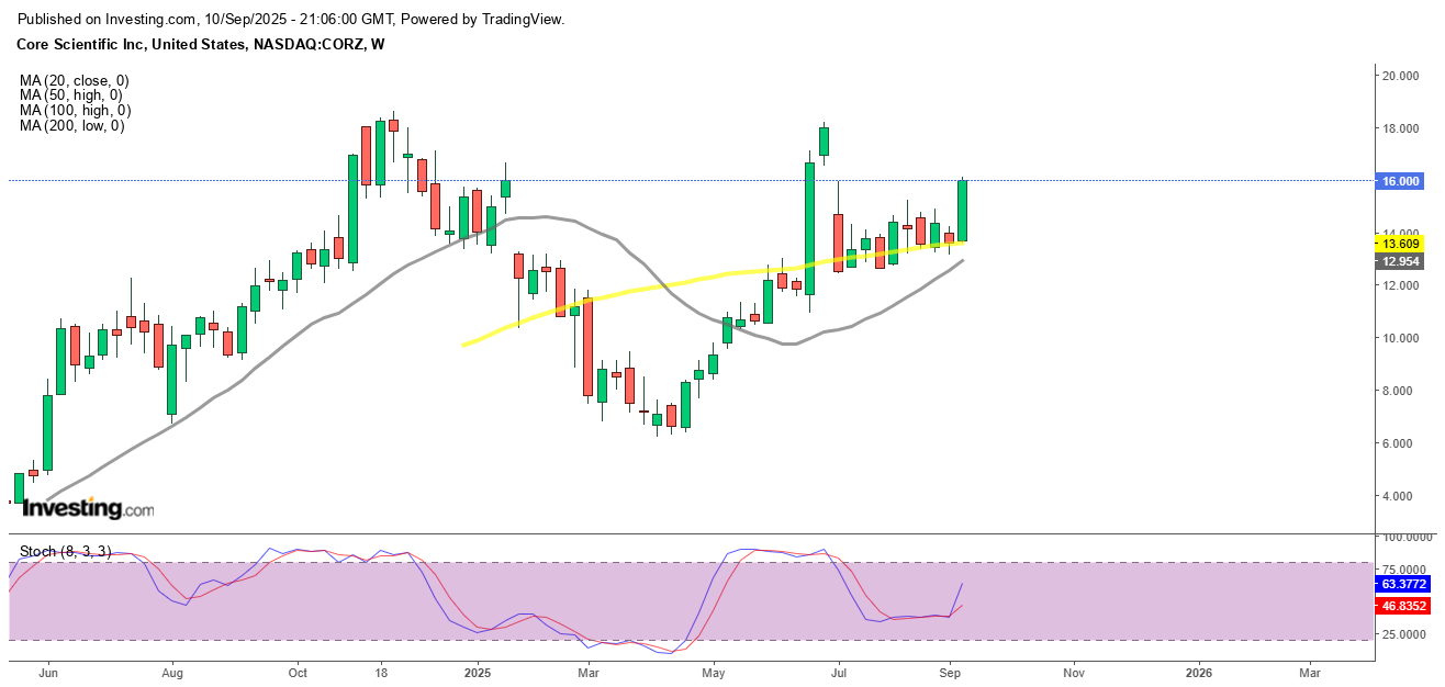 After weeks of pressure, Core Scientific stock closed Wednesday up nearly 10%, extending gains to more than 17% this week. Shares are now trading above $16, eyeing a return to the all-time highs of $18.66. Technical support from the 50-day SMA has helped stabilize the stock, fueling confidence in its recovery.