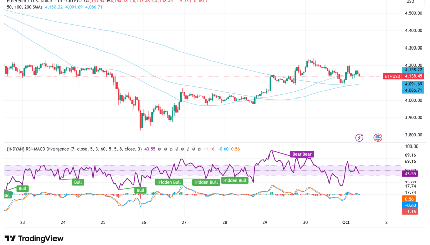 Ethereum (ETH) is trading at about $4,100 as of Tuesday. It has stayed stable even though the market as a whole has been going through