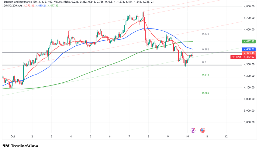ETH has pulled back into its 200-period moving average on the 4-hour chart after being turned down for the fourth time at the $4,800 resistance level in less than ten weeks. This is an important dynamic support level that often serves as a pivot point for market direction. The present range of $4,300 to $4,340 is where the 50-, 100-, and 200-period moving averages all meet. This suggests that this dip could just be a technical retest before another attempt to reach higher levels.