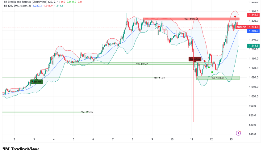 As BNB gets closer to $1,300, technical analysts say the $1,280–$1,320 range is the next target area. This location lines up with recent trading clusters when a lot of profit-taking happened, but the present momentum makes it look like this resistance might break down. If the price closes above $1,320, it might mean that a structural reversal is starting, which would open the door for more upside toward the $1,350–$1,400 levels.
