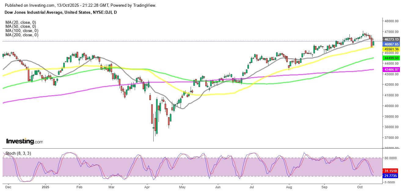 The Dow Jones Industrial Average climbed 587.98 points, or +1.29%, to close at 46,067.58, snapping back from Friday’s steep losses. Financial and industrial stocks led the recovery, supported by signs of improving trade sentiment between Washington and Beijing.