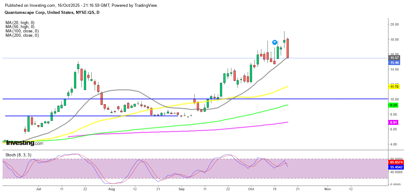 After surging above $19 for three consecutive sessions, QuantumScape (NYSE: QS) suffered a brutal reversal on Thursday, plunging 15% during trading hours and another 2% after hours, closing near $15.40. The steep fall erased its recent upward momentum and signaled waning investor confidence following a wave of enthusiasm around its latest product showcase.