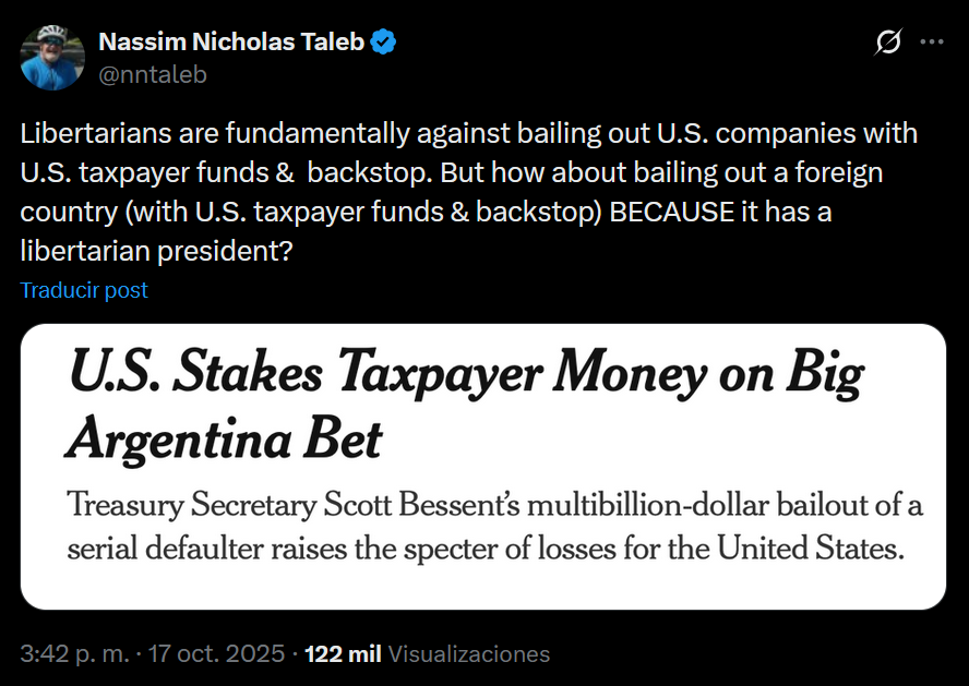 Nassim Taleb, author of The Black Swan and one of today’s most influential writers, ridiculed both libertarians and Donald Trump for rescuing Argentina.