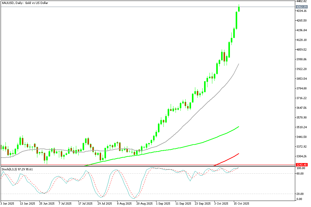 Although demand for safe haven assets is still high, gold fell precipitously from record highs following the Fed’s most recent rate decrease as profit-taking was prompted by Powell’s cautious tone. Earlier this week, gold jumped beyond $3,700 and reached $3,707.42 following the Federal Reserve’s announcement of a 25 basis point rate decrease to 4.25%. But the impetus soon waned, and prices dropped back to $3,627, a $80 decline from the new all-time high. As traders locked in profits after the rally driven by dovish predictions, there was a sudden fall but buyers returned on Friday pushing the price $60 higher. Yesterday buyers continued to push and XAU reached another record high at $4,379 but on Friday we saw a $200 crash.