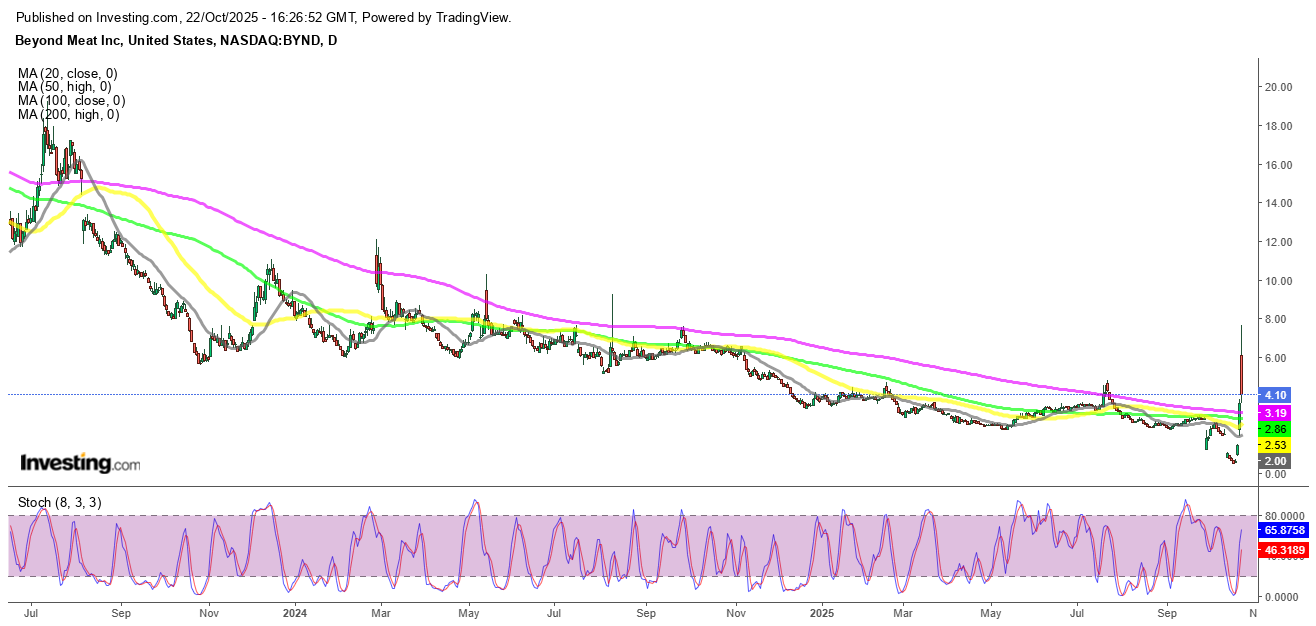 Once hailed as the future of food, Beyond Meat (NASDAQ: BYND) has now become a stark reminder of how fast hype can evaporate. The stock — which traded above $240 at its 2019 peak — briefly soared to $7.70 on Wednesday before collapsing to $3.58, erasing 55% of its gains within hours.