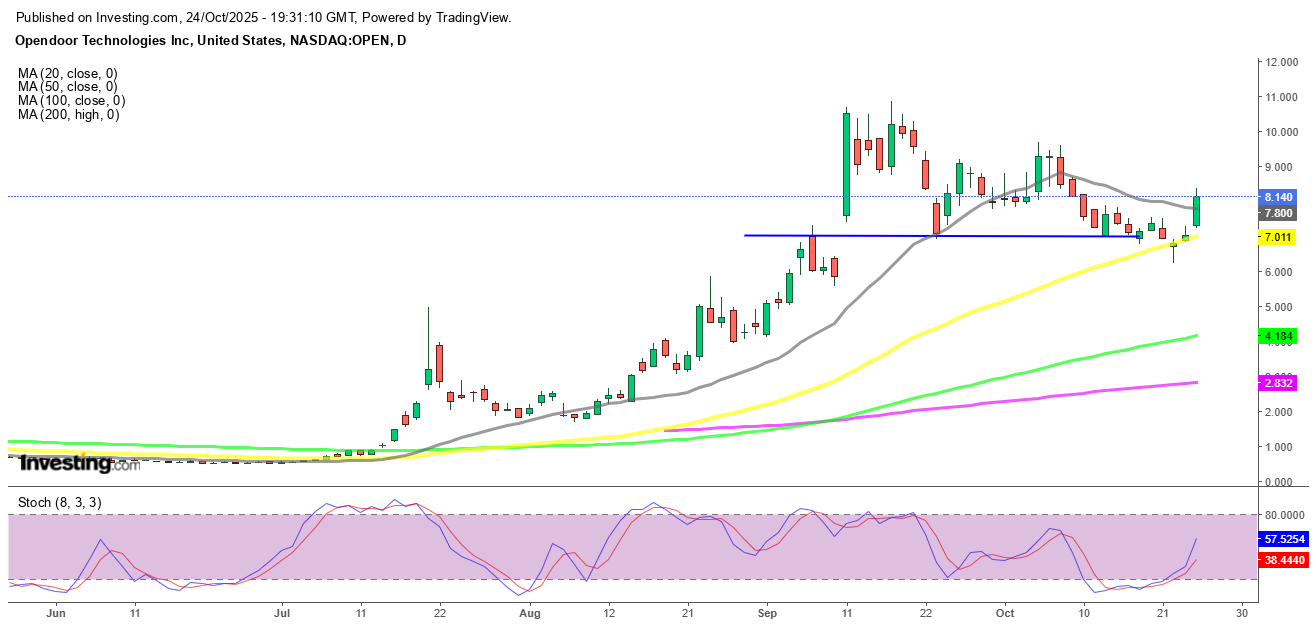 As a result, the average 30-year U.S. mortgage rate dropped to 6.19%, its lowest in over a year, rekindling optimism in the housing sector. This development sparked renewed buying momentum in Opendoor shares, helping the stock reclaim the $8 level and push decisively above the 20-day SMA, suggesting the potential for further upside.