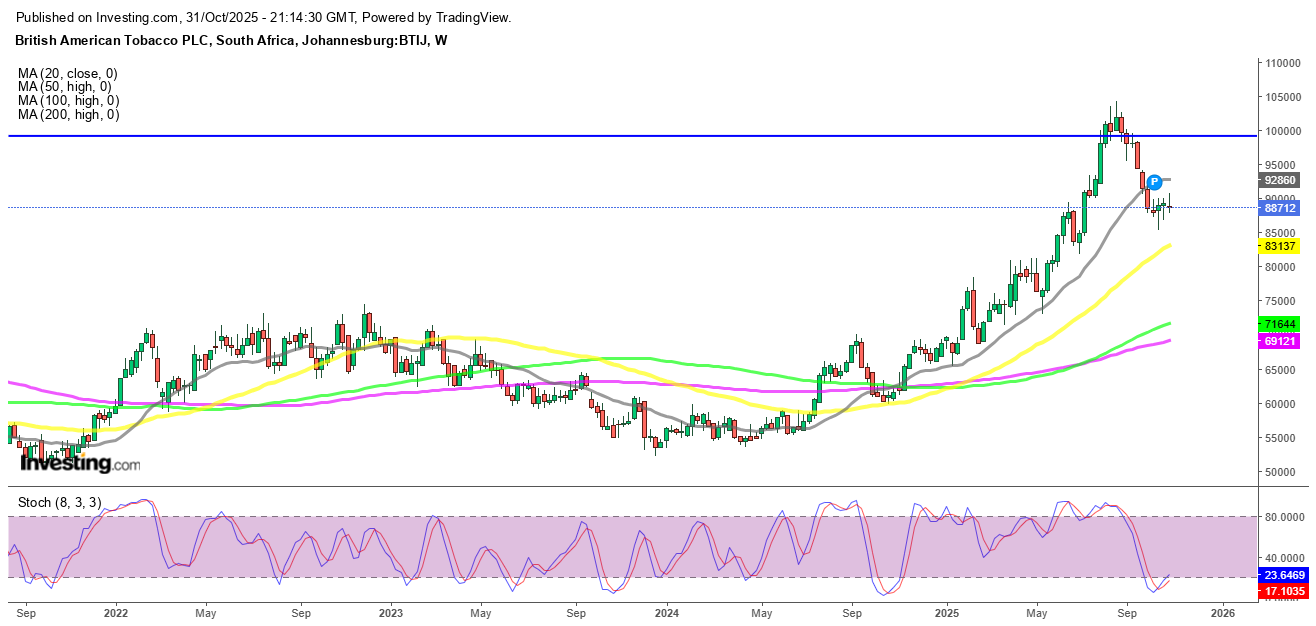After rallying to a record R1,045 in August, British American Tobacco (JSE: BTI) has struggled to maintain momentum. The stock fell 12.5% in September, slipping below its 20-week moving average to around R855, but has since stabilized. Despite reporting its weakest quarterly profit on record, shares remained within their October trading range, suggesting that investors had already priced in much of the bad news.