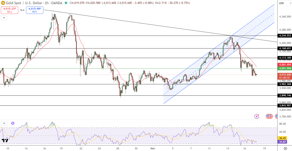 • Gold (XAU/USD) has fallen for four consecutive days, reaching $4,015 due to a stronger U.S. dollar and reduced expectations of a Federal Reserve rate cut in December.