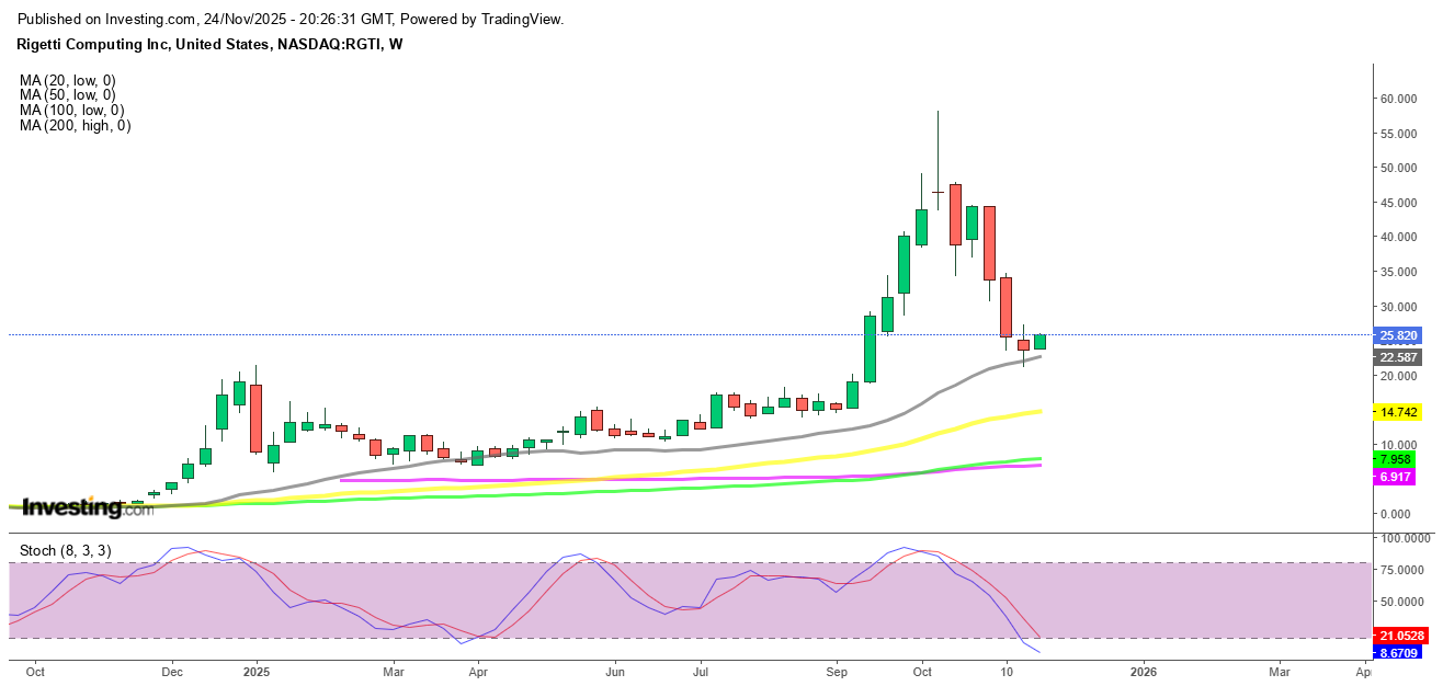 Yet the story has taken another twist. After briefly dipping to $21 on Friday, the stock found firm technical support and reversed higher. Improved sentiment across global markets on Monday helped drive a sharp rebound of roughly 10%, lifting RGTI close to $26 as the new week began. The bounce came as shares respected the 20-week simple moving average, where a classic doji formation appeared — often seen as a bullish reversal signal after a sustained decline. At the same time, the stochastic indicator moved into oversold territory, suggesting that a technical recovery was due.