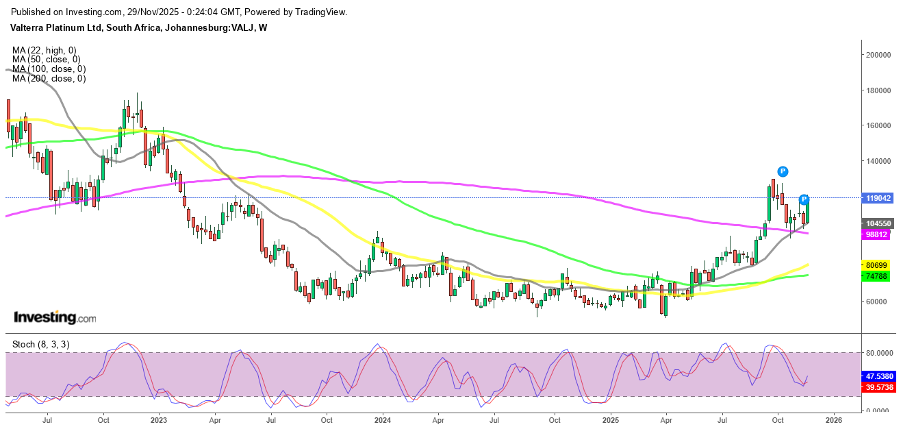 Valterra Platinum has begun to reassert its upward trajectory following a bout of volatility that unsettled the share price in late October. After a sharp slide earlier in the month—driven largely by weakness in global platinum prices—the stock found reliable support near R956.