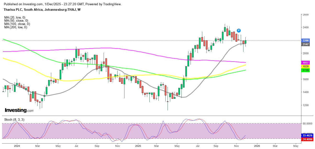 The stock rose 2.33% on Monday to close at R22, despite the reduced dividend. After retreating from September’s peak at R24.50 and finding support at the weekly 20-SMA near R20, the share price has resumed its upward momentum. Tharisa remains about 40% higher year-to-date, reinforcing confidence in the longer-term trend.