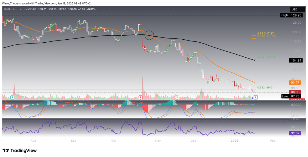 Meanwhile, the RSI has reached oversold territory, but currently shows no clear bullish or bearish divergence, leaving momentum direction unresolved. From a price-action perspective, Netflix retains the potential to bounce bullishly, with the next Fibonacci resistance levels located at $106 and $118.