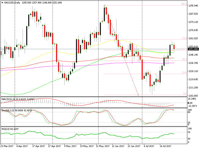 But yesterday the daily candlestick closed as a doji, which is a reversing signal. The price climbed as high as $1,259.40 which comes just below the 61.8% Fibonacci level.