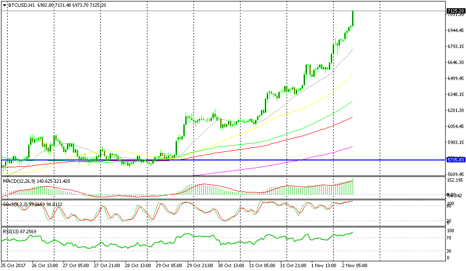 You see on the H1 Bitcoin chart that this digital currency has been absolutely surging in the last week. It was trading around the $5,700 region about five days ago, while today Bitcoin broke above the $7,100 level. Too bad I closed my long Bitcoin position early in the week.
