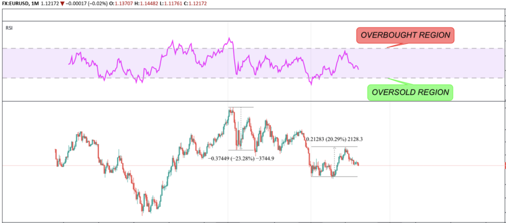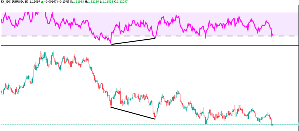 In the chart below, the RSI shows a bearish divergence. If the price surges while the RSI performs lower highs, it indicates that there will be a (massive) sell-off in the near future. The bigger the timeframe, the bigger the price movement. In this example, EUR/USD lost 15 percent after the divergence formed over two years in the monthly chart.